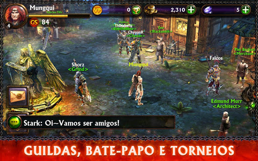 Una-se a guildas, converse em tempo real com outros jogadores e inspecione seus equipamentos!